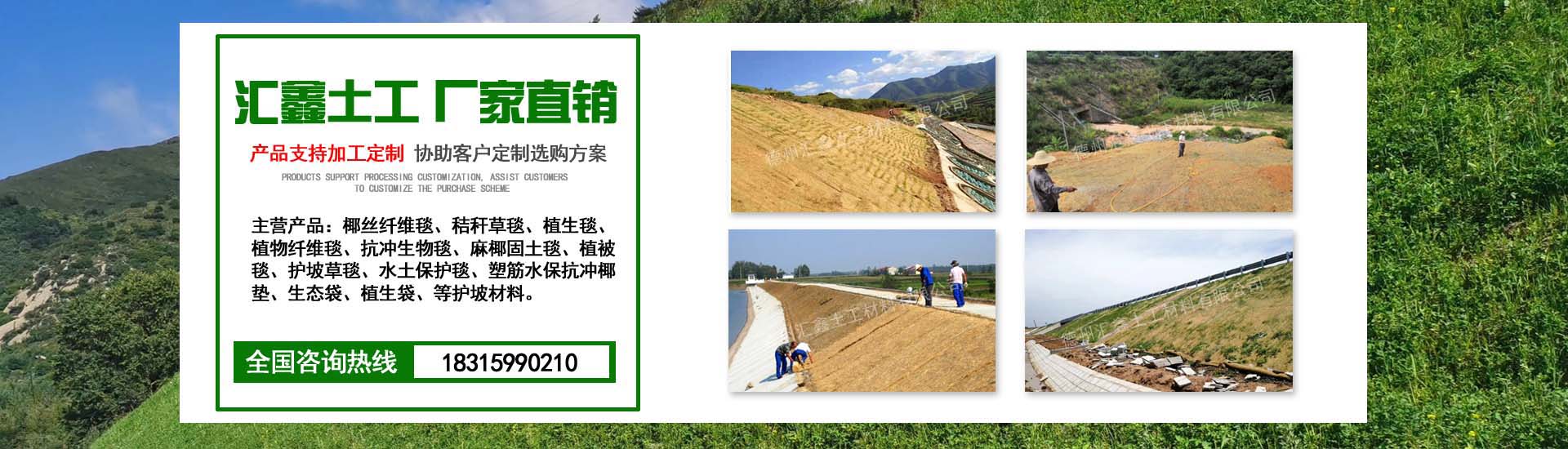 德州匯鑫土工材料有限公司是一家專業生態護坡產品、技術服務及施工為一體的綜合性企業。公司主要生產銷售植物纖維毯、植生毯、椰絲毯、抗沖生物毯、生態毯、秸稈纖維毯、麻椰固土毯、塑筋水保抗沖椰墊、生態袋、植生袋等各種護坡材料,產品廣泛應用于:高速公路邊坡綠化、山體邊坡綠化護坡、河道邊坡、人工湖邊坡防護及其他生態邊坡治理等工程。經廣大工程單位使用證明,產品質優價廉,施工方便,售后服務好,得到廣大客戶的一致好評。 "為客戶提供優質產品及服務"的宗旨, 熱誠希望攜手各界朋友,共鑄造彼此輝煌。 ...